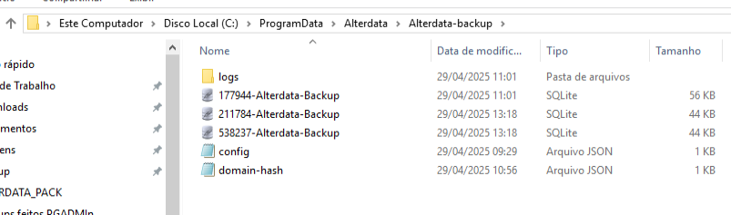 Por padrão, o BD do Alterdata Backup fica armazenado na máquina geralmente nesse caminho: C:\ProgramData\Alterdata\Alterdata-backup.