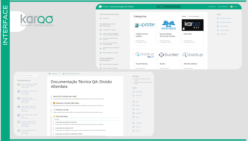 Exibe e permite a edição de artigos, glossários e dicas de forma estruturada (ex: Documentação Técnica QA). |