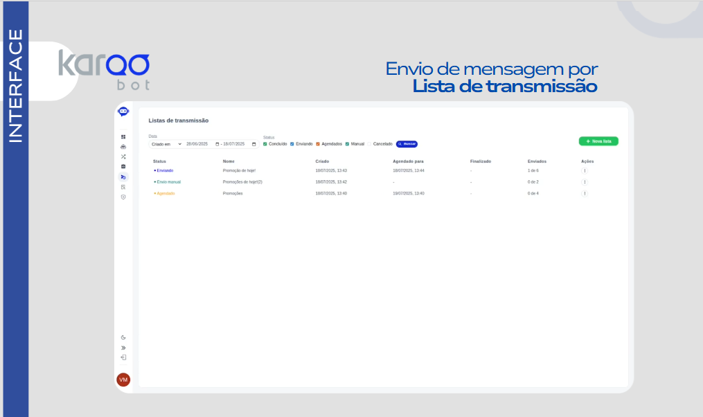Histórico Visualização completa de todos os atendimentos, incluindo status (concluído, transferido, etc.) e o tempo de duração da interação. Histórico, Atendimentos, Status, Duração, Registro