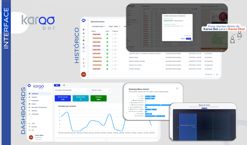 Transferência de Atendimento (na Interface) Funcionalidade para puxar clientes diretamente do Karoo Bot para o Karoo Chat para atendimento humano. Transferir, Chat, Karoo Chat, Atendimento Humano
