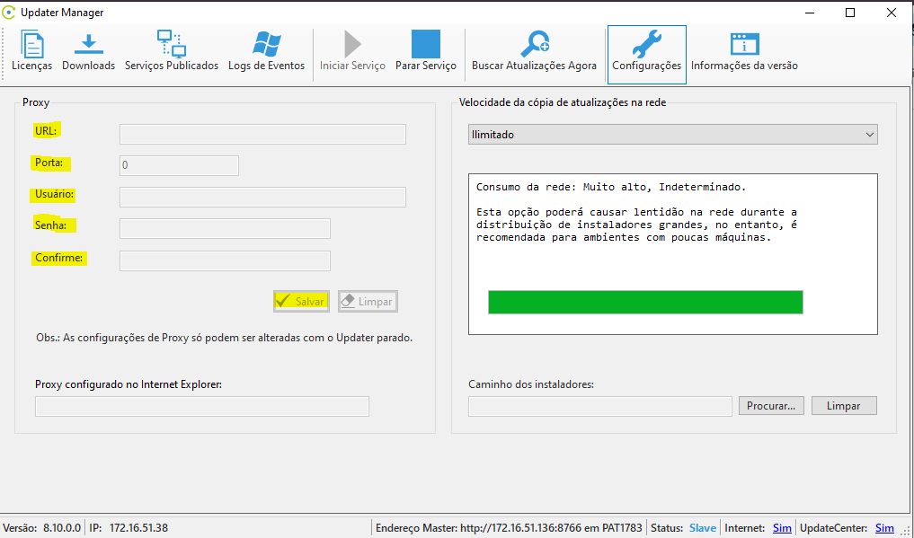 Configurar Proxy no Updater: Pare o serviço -> Aba Configurações -> Preencha os campos.